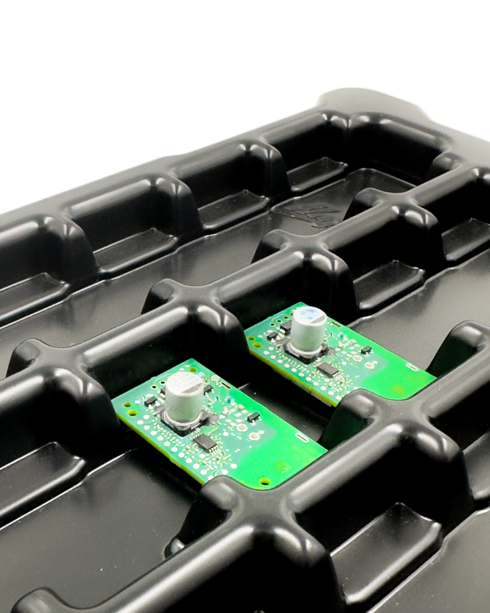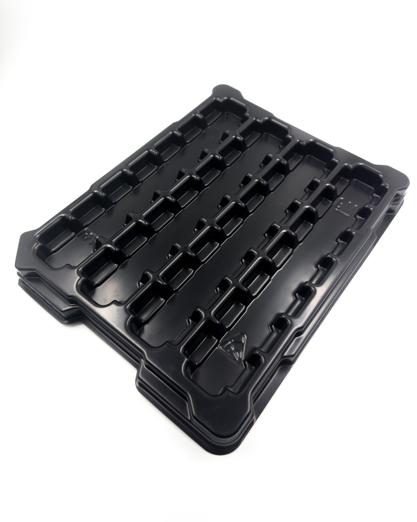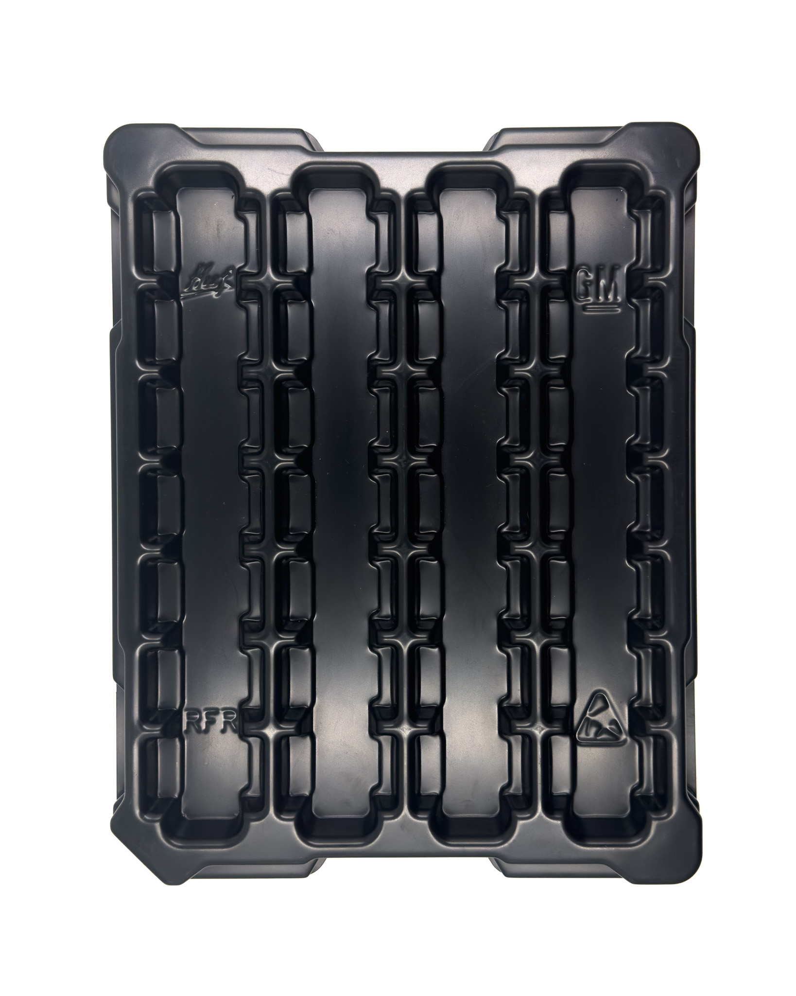 Charola Blister antiestática fabricada con HIPS ESD para protección de tabletas electrónicas.